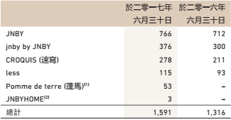 從門(mén)店情況來(lái)看,江南布衣該財(cái)年在全球經(jīng)營(yíng)的實(shí)體零售店總數(shù)由2016年6月30日的1316家增加至2017年6月30日的1591家,包含海外的39個(gè)經(jīng)銷(xiāo)點(diǎn)在內(nèi)。旗下各品牌門(mén)店悉數(shù)增加,其零售網(wǎng)絡(luò)覆蓋中國(guó)內(nèi)地所有省、自治區(qū)和直轄市及全球其他17個(gè)國(guó)家和地區(qū)。