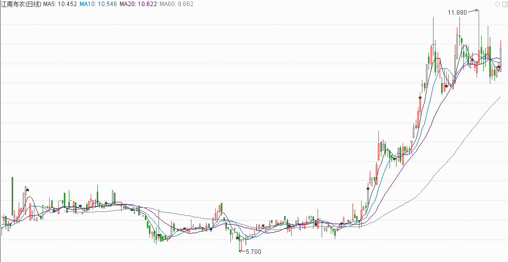 受業(yè)績(jī)被持續(xù)看好的影響,江南布衣股價(jià)從今年下半年開(kāi)始跳空上漲,自上市以來(lái)股價(jià)已累計(jì)上漲超60%,并一度在11月16日盤(pán)中創(chuàng)出上市以來(lái)最高11.88港元/股,市值接近60億港元。截止今日收盤(pán)報(bào)收10.8港元/股,漲幅3.655%。