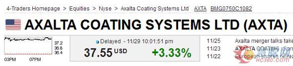 截止至11月29日晚上22:01,艾仕得的股價為37.55美元,上漲了3.33%,立邦自11月22日起開始停牌。艾仕得的股票在紐約證券交易所上市,市值約為82億美元,受收購傳聞的影響,現(xiàn)在已上漲至88.5億美元,而立邦的市值約為1.2萬億日元(107億美元)。
