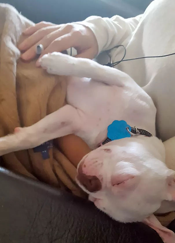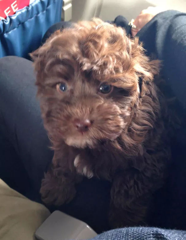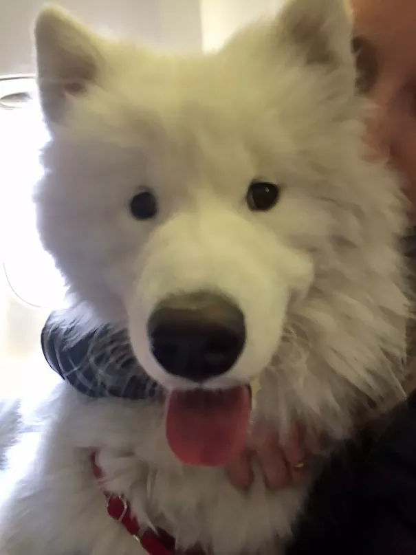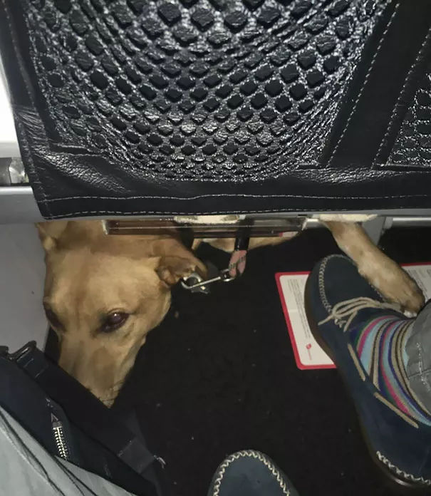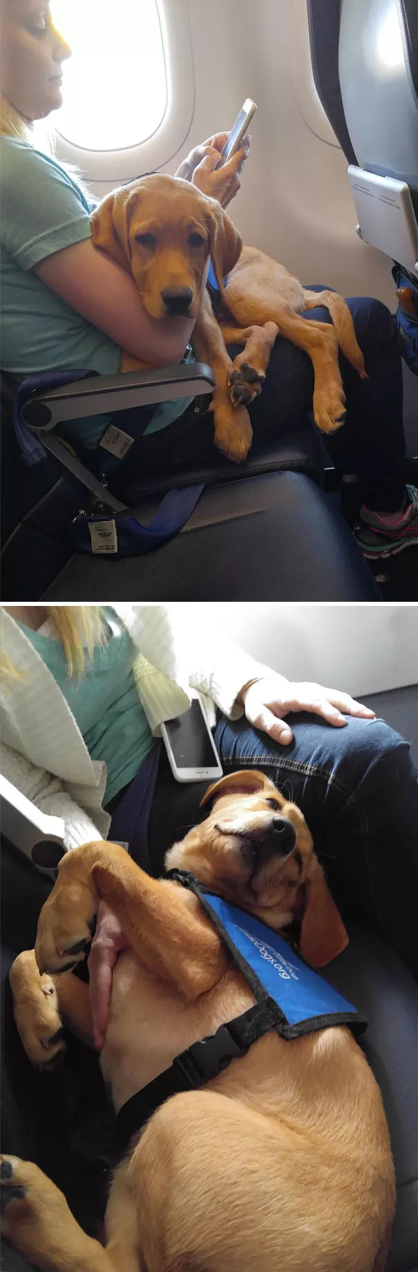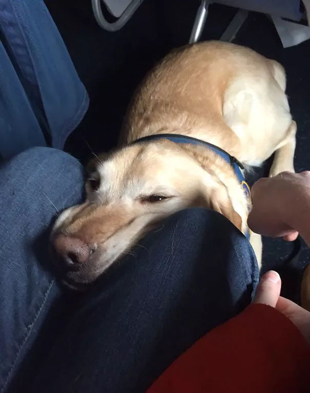 “這是我第一次帶著狗飛行,機組幫我們升到了頭等艙,她現(xiàn)在靠在一個隔壁陌生姐姐的腿上睡著了,完美!”
