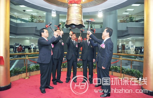 先河環(huán)保是環(huán)境監(jiān)測行業(yè)首家上市公司,圖為董事長李玉國等人敲響上市寶鐘