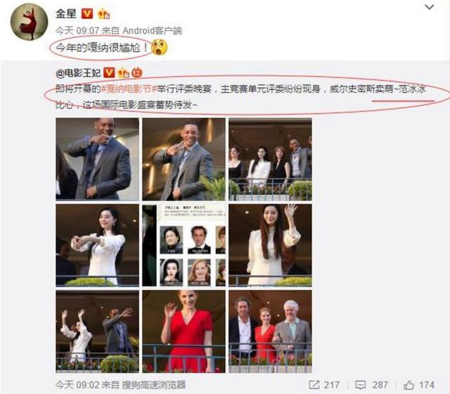 當(dāng)范冰冰作為評委,亮相戛納電影節(jié)紅毯時,金星轉(zhuǎn)發(fā)微博評論到:今年的嘎納很尷尬!將“戛納”字打錯的金星,這次暗諷似乎不太走心。