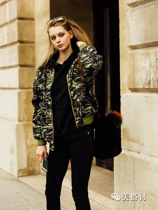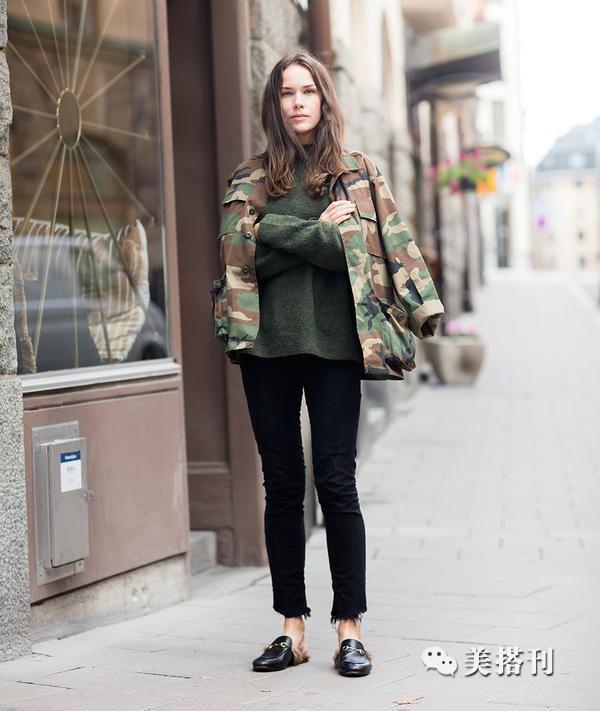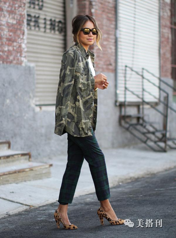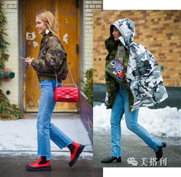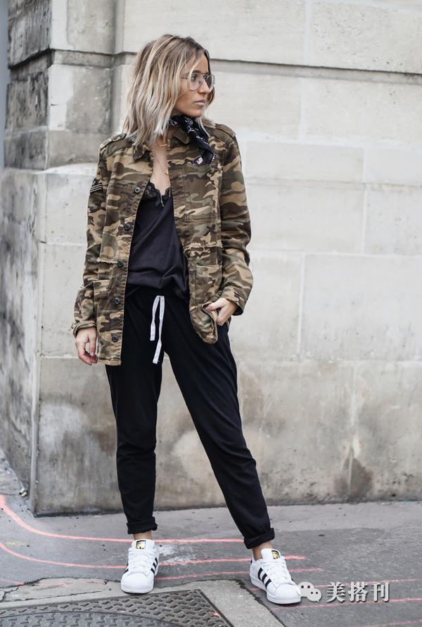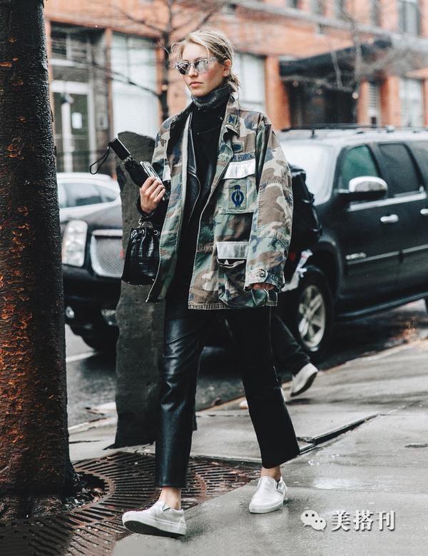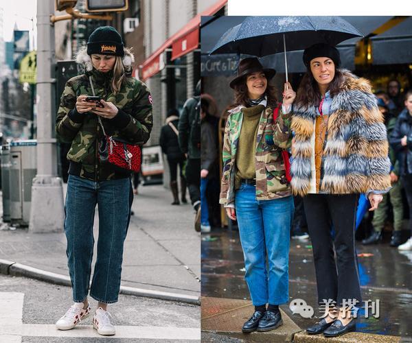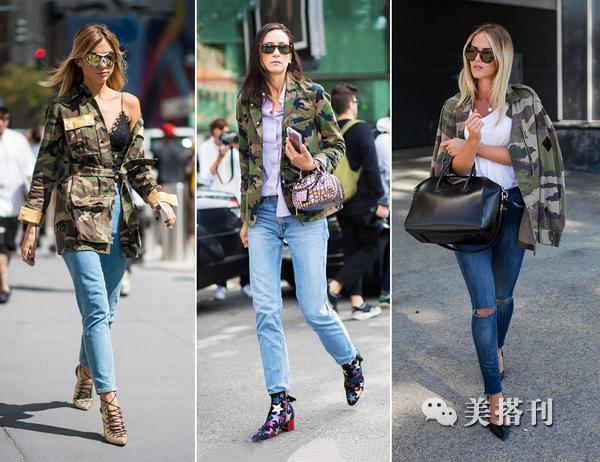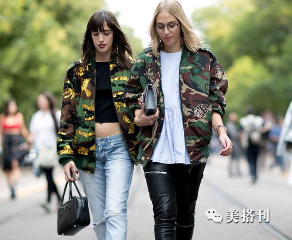 ▲除了秀場,街拍中也是屢屢見到迷彩夾克的身影,想要和時髦精一樣將迷彩服穿出自己的風格?那么,迷彩夾克怎么搭配要先知道哦。