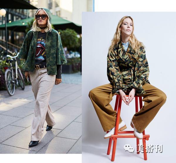 ▲同樣走復古風的闊腿褲,搭配迷彩夾克卻是另外一種效果,與錐形褲不同的是,闊腿褲幾乎不挑身材,腿粗腿細的姑娘都可以嘗試。