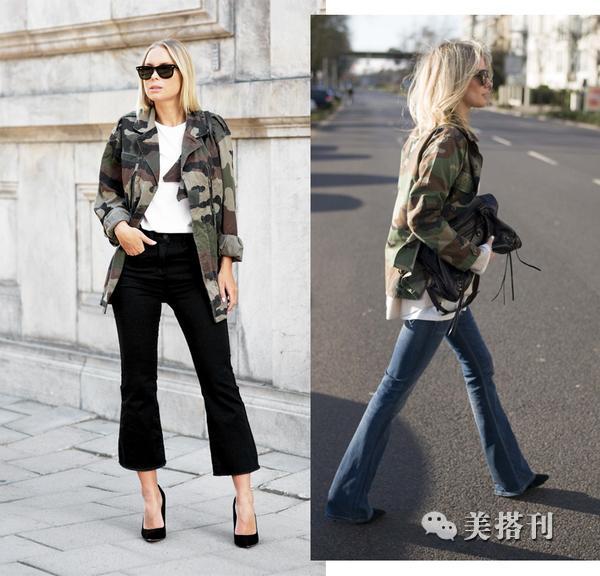 ▲這幾年的流行趨勢都比較偏向復古風,喇叭褲也是一個復古風單品,但是相比較錐形褲的干練,闊腿褲的時髦,喇叭褲詮釋更多的是優雅,優雅的喇叭褲是很有女人味的一件單品,混搭迷彩夾克就穿出了當下最流行的“娘man”結合混搭。