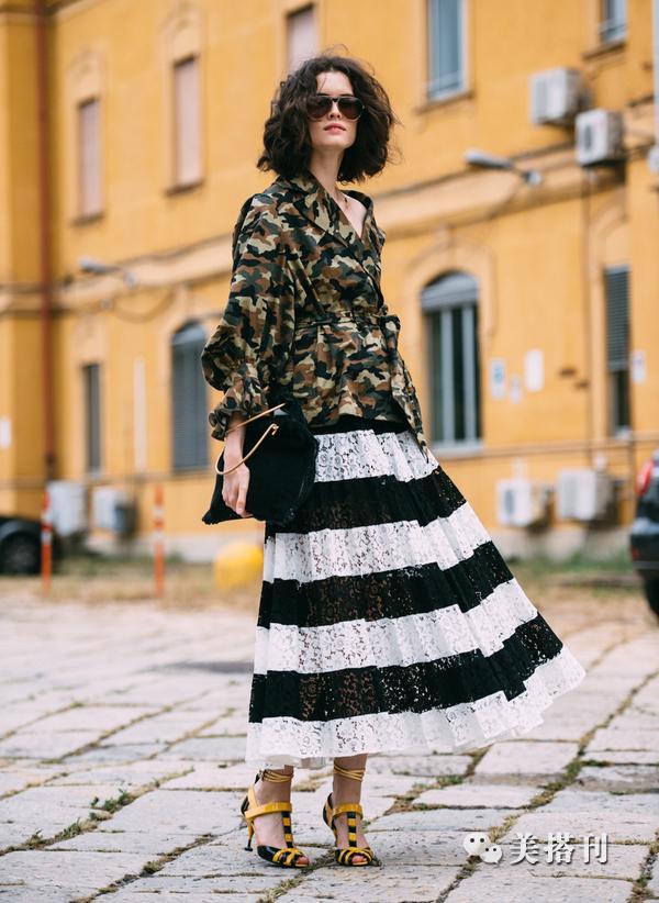 ▲帥氣的迷彩夾克不是中性化單品嗎?混搭最具女人味的半身長裙,居然也能這么好看?這就是混搭的奇妙之處,既有軍人般的英姿颯爽又透露著優雅女人味。