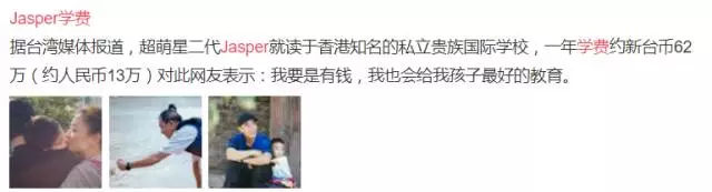 加上最近又網(wǎng)友爆出了Jasper現(xiàn)在讀的全日班,學(xué)費(fèi)每年16萬港幣(約合人民幣13.1萬),這個(gè)價(jià)格是廣大吃瓜群眾都付不起的,感嘆一下明星的經(jīng)濟(jì)能力。對此,很多網(wǎng)友表示支持:如果我有能力也會讓自己的孩子上最好的學(xué)校。