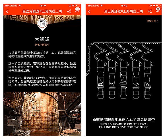 比如,掃一掃大廳中央的“大銅罐”,就可以看到其中的說明介紹,它是“咖啡豆在烘焙后的休息所”,在地圖導(dǎo)覽里,可以分別看到一層和二層不同的介紹。