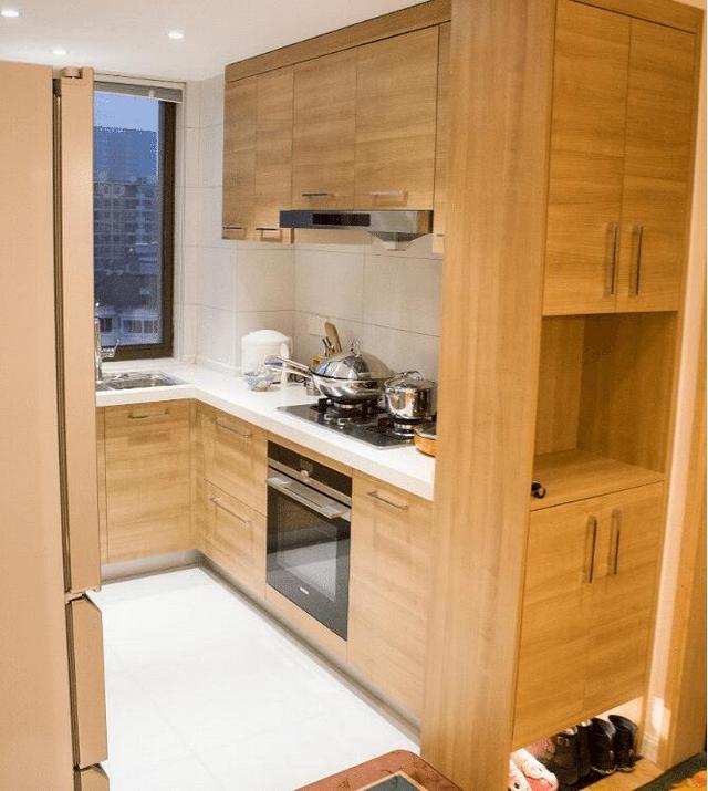 入戶邊上就是開放式廚房了,鞋柜還有隔斷效果。廚房柜子也是原木色調的,至于臺面用的白色石英石的。