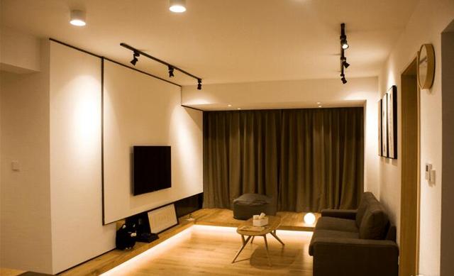 客廳原木色搭配白色和黑色,沒買電視柜直接設計了小地臺一直延伸到陽臺,加高部分都安裝了燈帶,效果很漂亮。