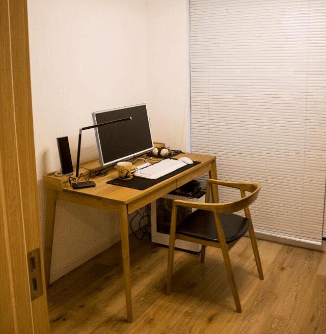 書房為了保持風格統(tǒng)一,也是選的原木家具,簡易輕便。窗戶選擇卷簾設計。