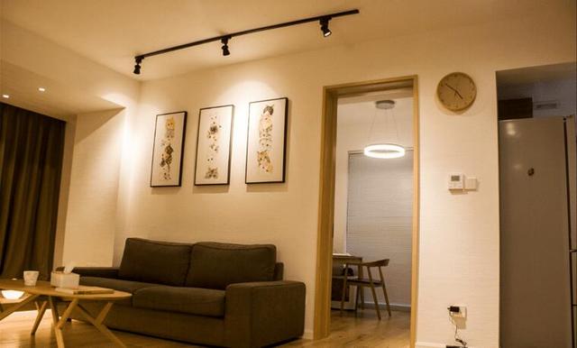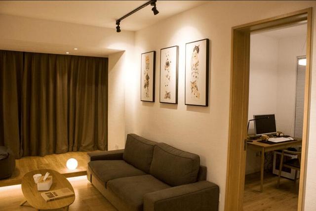 兩座小沙發(fā)和簡易茶幾,沙發(fā)墻布置了一些掛畫裝飾,沙發(fā)墻后邊就是書房。