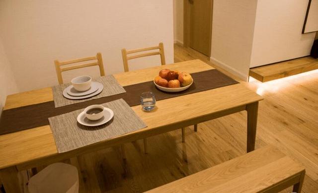 餐廳,原木色簡易餐桌椅子一套,木制的質量還不錯,和整體風格蠻搭配的,特意買了桌旗布置上去。