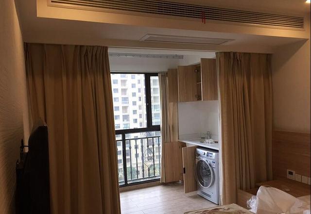 主臥外邊的生活陽臺,洗衣柜和吊柜都設計了,收納柜多點總歸是好的。沒有設計推拉門,直接用窗簾替代了。這樣主臥更寬敞一些。