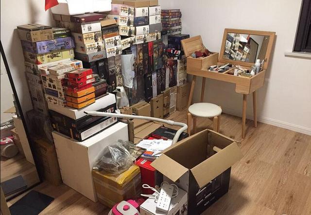 次臥暫時擺放這一堆物品,上邊這些小盒子都是老公收集的模型,感覺都快沒地方放了。化妝桌也暫時擺放在這,過些天在好好收拾下。