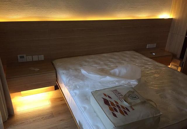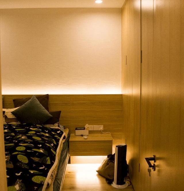 主臥也是原木風設計,兩個床頭柜都是懸空設計的,底部都安裝了照明燈,主要是起夜的時候開燈不會刺眼。臥室背景墻也布置了燈槽,看著不錯吧。