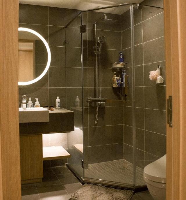 衛(wèi)生間采用的灰色瓷磚,最重要的一點就是耐臟,又不會像黑色那么壓抑。洗漱盆設計還可以,中空加了燈帶。