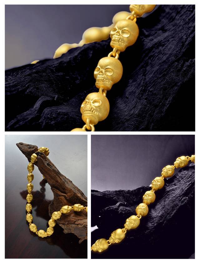 而飾品材質(zhì)中,黃金的可塑性很強, 周生生大膽突破傳統(tǒng)框架,使用倒模工藝打造骷髏頭黃金飾品,加添硬朗型格,新穎時尚。