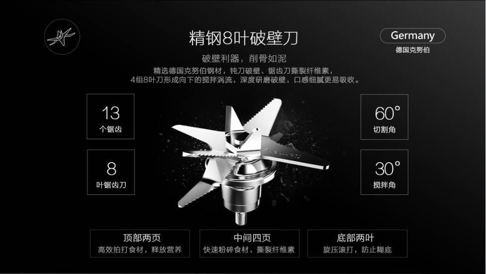 “鋼鐵俠”破壁機精選德國克虜伯鋼材,4組8葉破壁刀形成攪拌渦流,深度研磨破壁,保證食物得到充分攪打,營養充分釋放;