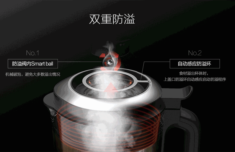 防溢閥內Smart ball+自動感應防溢環促成雙重防溢設計,機械破泡配合自動感應防溢程序,避免食物溢出;