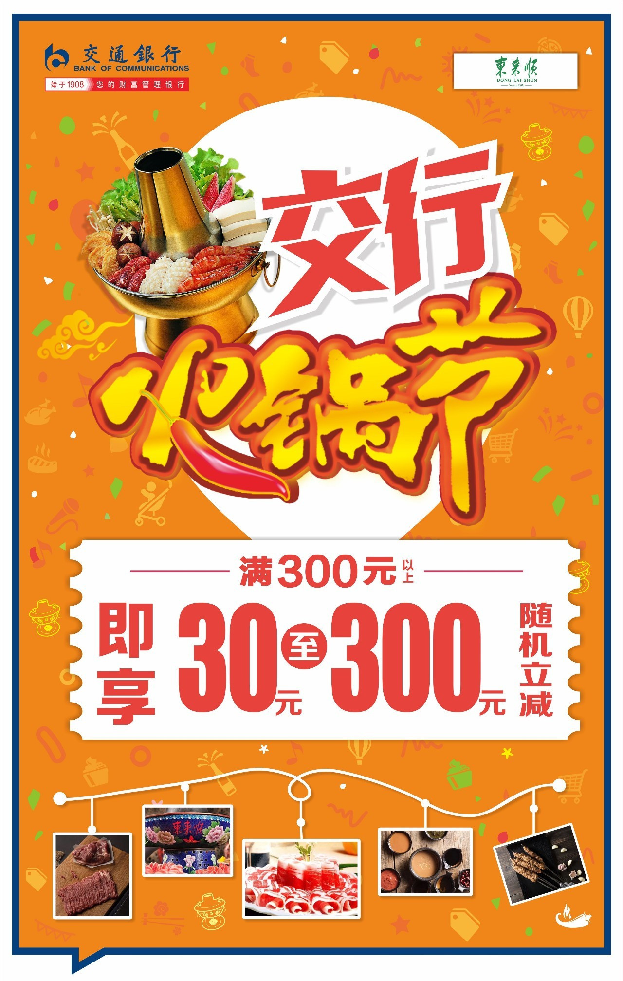 熱騰騰的火鍋,夾一筷子鮮嫩的羊肉,蘸上五味調(diào)和的小料,鮮而不膻。更有每周日交通銀行刷卡滿300元即享30-300元隨機(jī)立減優(yōu)惠。