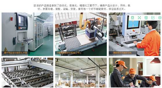 歐派家居集團(tuán)股份有限公司創(chuàng)立于1994年,2009年成立“廣東歐派集團(tuán)”,2013年更名為歐派家居集團(tuán)股份有限公司。歐派是全國(guó)工商聯(lián)櫥柜專(zhuān)業(yè)委員會(huì)會(huì)長(zhǎng)單位、國(guó)家《住宅廚房》和《住宅整體衛(wèi)浴間》標(biāo)準(zhǔn)編制單位,共獲得中國(guó)環(huán)境標(biāo)志認(rèn)證產(chǎn)品等國(guó)內(nèi)外權(quán)威部門(mén)授予的60余項(xiàng)認(rèn)證和榮譽(yù)稱(chēng)號(hào)。 歐派引進(jìn)德國(guó)豪邁柔性生產(chǎn)線(xiàn),產(chǎn)品制造過(guò)程自動(dòng)化、信息化、精細(xì)化三管齊下,確保產(chǎn)品從設(shè)計(jì)、開(kāi)料、裁切、表面處理、裝配、運(yùn)輸、安裝到服務(wù)每一環(huán)節(jié)都做到更好,保證高品質(zhì)產(chǎn)品。原材料選用符合E1級(jí)標(biāo)準(zhǔn)環(huán)保板材,融合中國(guó)傳統(tǒng)文化理念和歐美前沿時(shí)尚設(shè)計(jì)的元素,為消費(fèi)者提供優(yōu)質(zhì)產(chǎn)品。