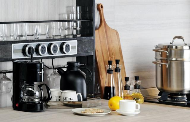 在廚電、水槽等標準柜體寬幅外,櫥柜打造千萬不要浪費任何剩余空間。可以密集收納小家電的窄高柜,讓一切井井有條。墻上的隨意停插座,避免電線不夠長的尷尬