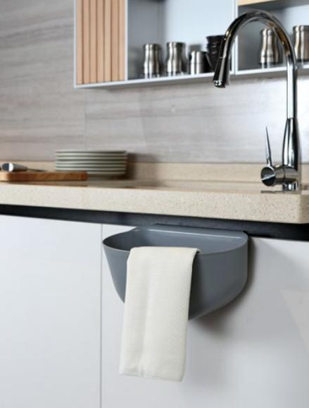 在水槽地柜柜門外懸掛一個收納盒,隨手可將用過的清潔布收納于此,擦手巾也可以放這里。