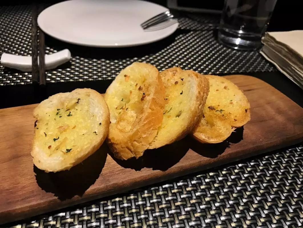 上菜前會(huì)贈(zèng)送餐前面包,切片的蒜香法棍擺在木質(zhì)托盤上呈上桌來。