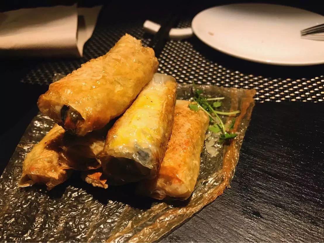 外形有點(diǎn)像港式的腐皮卷。炸油豆皮裹著菌絲、豆芽、筍條、胡蘿卜絲,再配上辣椒蘸醬。豆皮的焦香、鮮美的菌香、蔬菜的清香和辣味完美的融合在一起。是一道不錯(cuò)的素食。