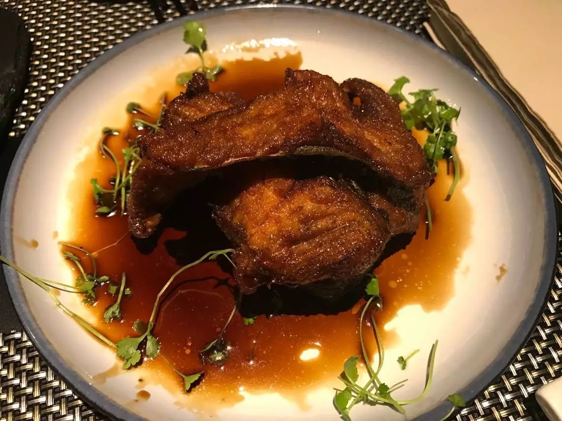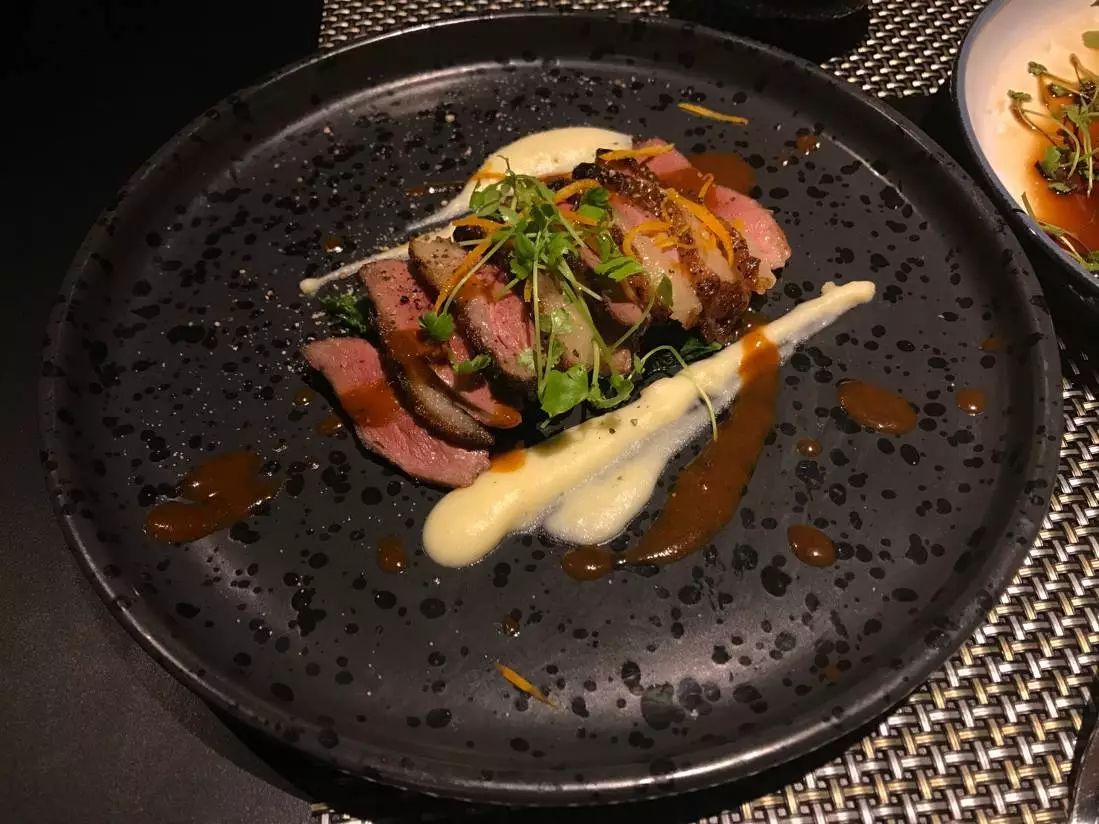 這道菜,鴨胸切片,汁水所在肉里,口感軟嫩多汁。鴨皮切花,金黃香脆。皮脂連接處會(huì)有少許脂肪,烘烤的熱力燃燒出肉質(zhì)本身的脂香。