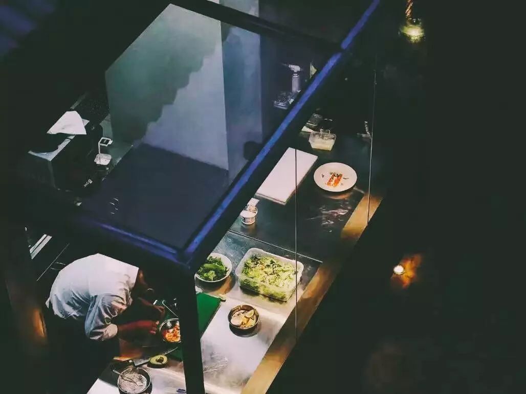 下樓后穿過庭院,能看到廚師在玻璃房子里面工作。各個(gè)空間相連,一個(gè)空間的入口可能連接著另一個(gè)空間的出口。有的客人進(jìn)店后并沒有推門左拐,是直接向前走,穿過通道進(jìn)入庭院。離店的時(shí)候才從另一個(gè)入口走的星光走廊。對(duì)不同路線無意識(shí)的選擇,或許帶來不一樣的就餐感受。
