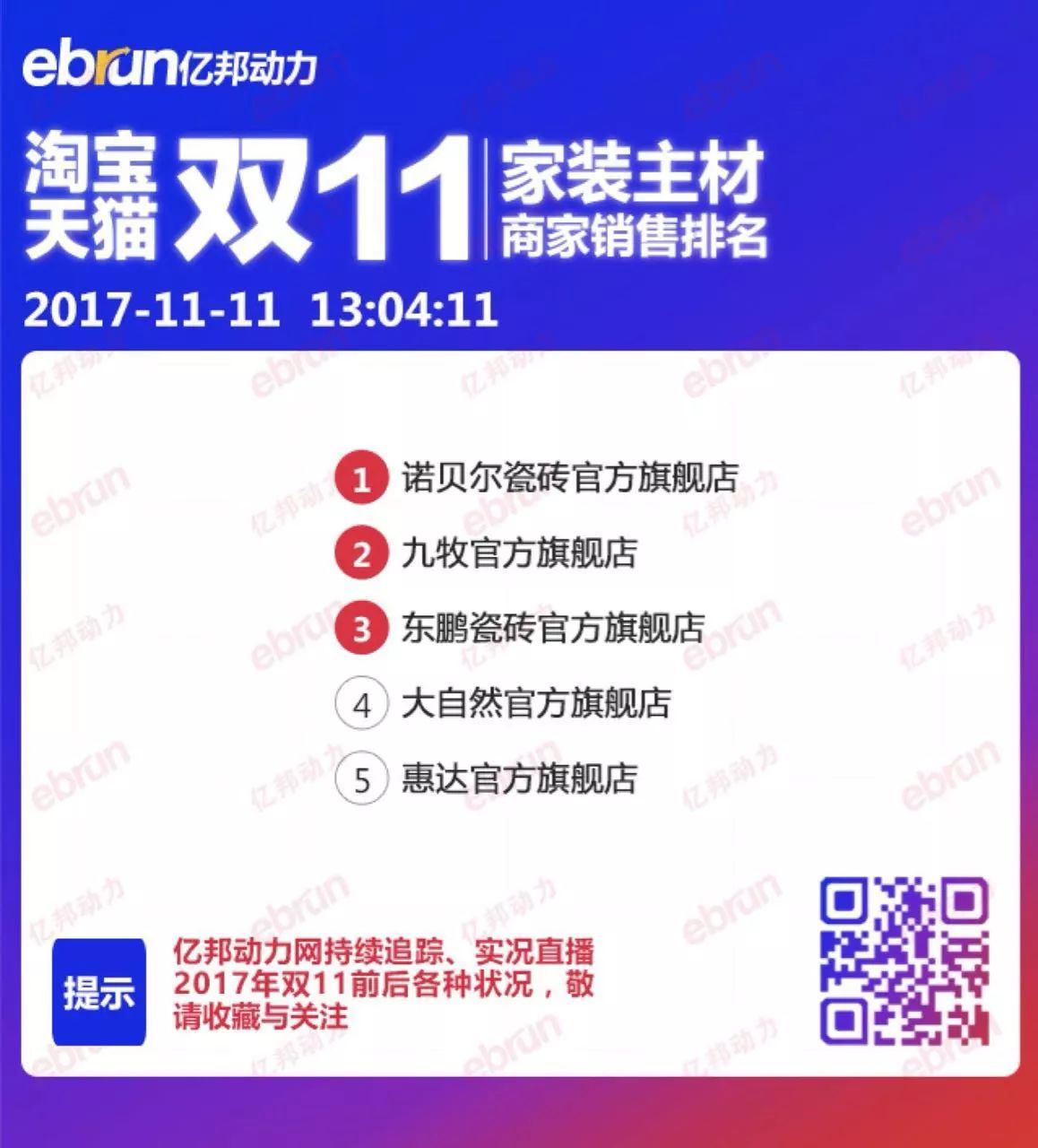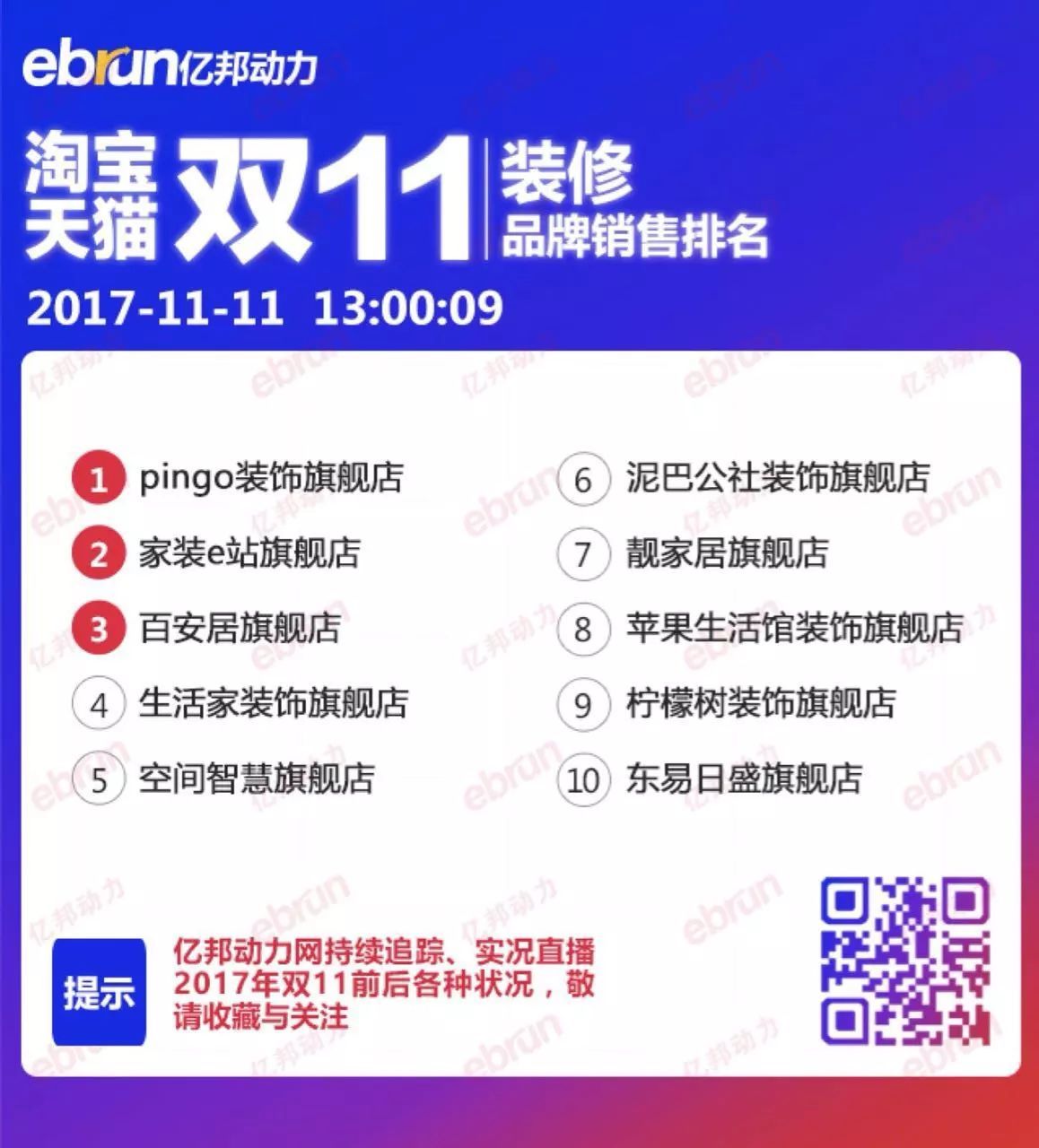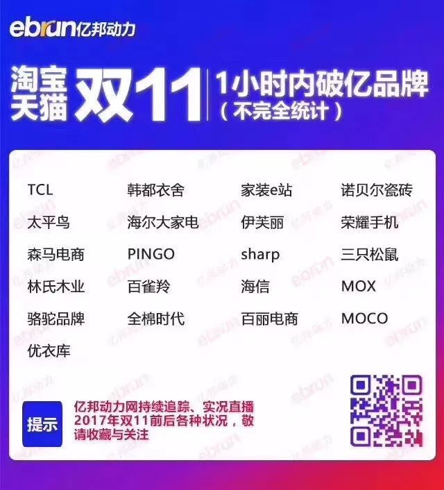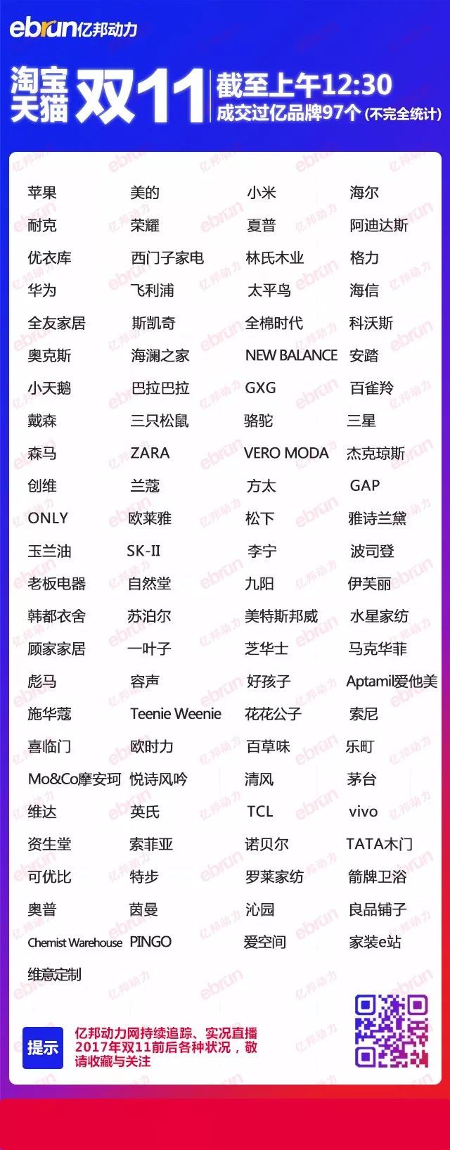 1小時20分,華日家居旗艦店破5000萬! 1小時16分可優(yōu)比旗艦店破8000萬! 1小時10分,海爾全網(wǎng)銷售額破3.78億! 1小時10分,奧普天貓銷售額破7000萬! 1小時8分,全棉時代破2億! 1小時7分,蘭蔻旗艦店銷售金額破1億! 1小時5分,太平鳥男裝破2億! 1小時3分45秒,羅萊家紡官方旗艦店破6000萬! 1小時3分23秒,太平鳥童裝破3615萬,突破去年全年記錄! 1小時3分,林氏木業(yè)破4億! 1小時1分鐘,東箭完整家居破2億! 1小時3秒,E店寶全網(wǎng)交易額破130億,全網(wǎng)累計訂單量破7千萬。 1小時,伊芙麗品牌1.19億! 1小時,廣州大麥銷售額達(dá)1.53億。 1小時,旺店通ERP全網(wǎng)銷售額破百億。 1小時,周大福破5000萬!天貓珠寶類目第一 59分鐘,尚品宅配銷售額破3000萬! 50分18秒,韓都衣舍集團(tuán)交易額破2億!去年用時1小時36分3秒!