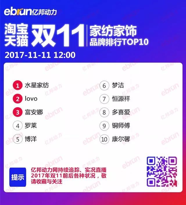 截至1點(diǎn)整,家紡家飾銷售額top10:水星家紡、lovo、富安娜、羅萊、博洋、夢潔、銅師傅、恒源祥、多喜愛、康爾馨
