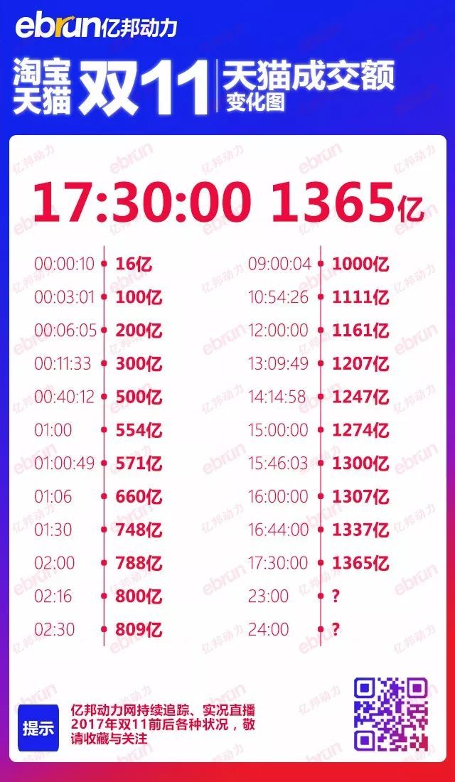 截止17點(diǎn)57分,2017天貓雙11全球狂歡節(jié)成交額1380億元。