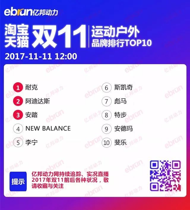 截至1點(diǎn)整,運(yùn)動戶外銷售額top10:耐克、阿迪達(dá)斯、NEW BALANCE、安踏、李寧、斯凱奇、彪馬、安德瑪、斐樂、特步