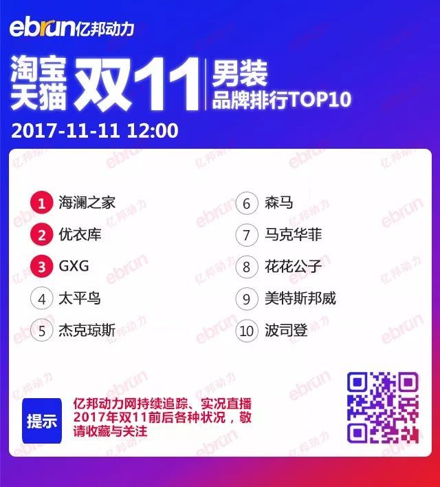 截至1點(diǎn)整,男裝銷售額top10:海瀾之家、優(yōu)衣庫、GXG、太平鳥、杰克瓊斯、森馬、馬克華菲、美特斯邦威、花花公子、思萊德