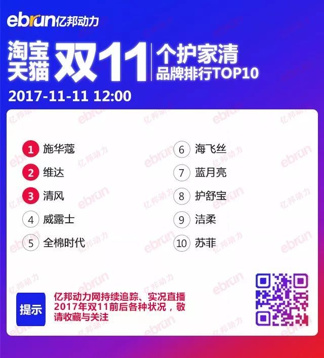 截至1點(diǎn)整,個護(hù)家清銷售額top10:施華蔻、維達(dá)、清風(fēng)、威露士、全棉時代、海飛絲、護(hù)舒寶、藍(lán)月亮、潔柔、蘇菲