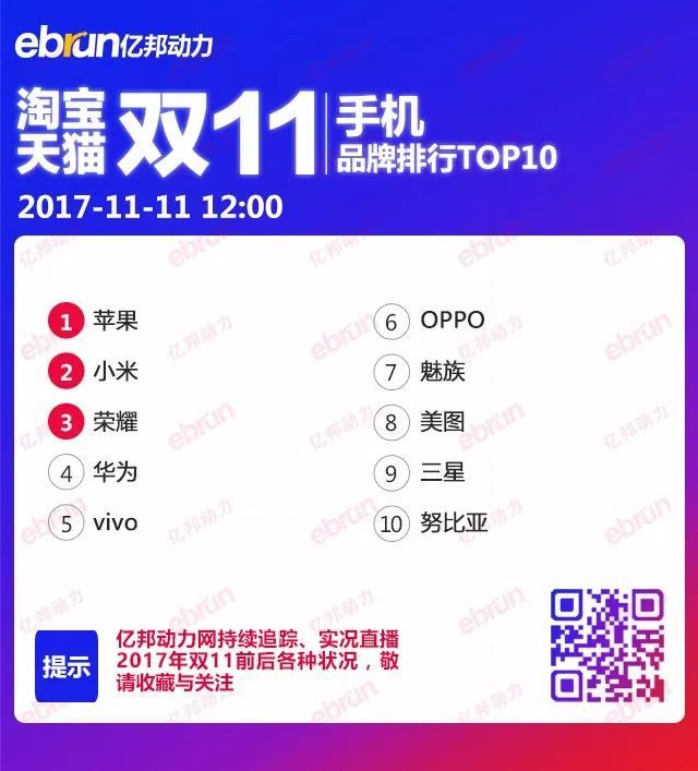 截至1點(diǎn)整,手機(jī)銷售額top10:蘋果、榮耀、小米、華為、vivo、POOP、魅族、美圖、三星、努比亞
