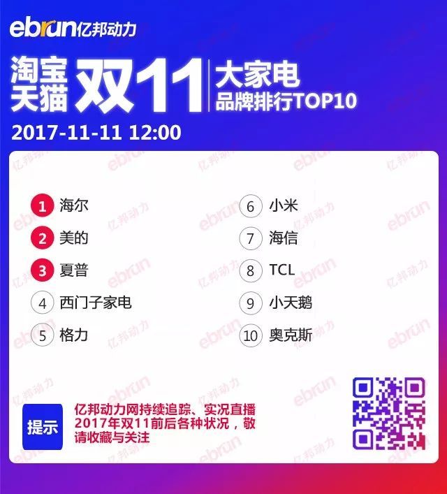截至1點(diǎn)整,大家電銷售額top10:海爾、美的、夏普、西門子家電、格力、海信、小米、TCL、小天鵝、奧克斯