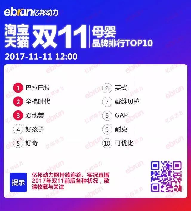 截至1點(diǎn)整,母嬰銷售額top10:巴拉巴拉、全棉時代、好孩子、愛他美、英氏、GAP、戴維貝拉、好奇、耐克、可優(yōu)比