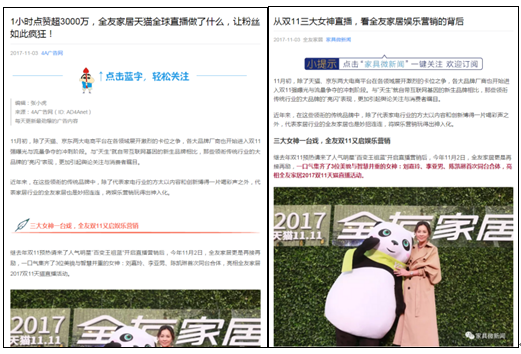 此次全友家居的明星營銷也獲得了包括4A廣告網(wǎng)、營銷最前線、廣告君、家具微新聞、家具產(chǎn)業(yè)、泛家居圈等營銷大號和家居行業(yè)大V的廣泛關(guān)注。