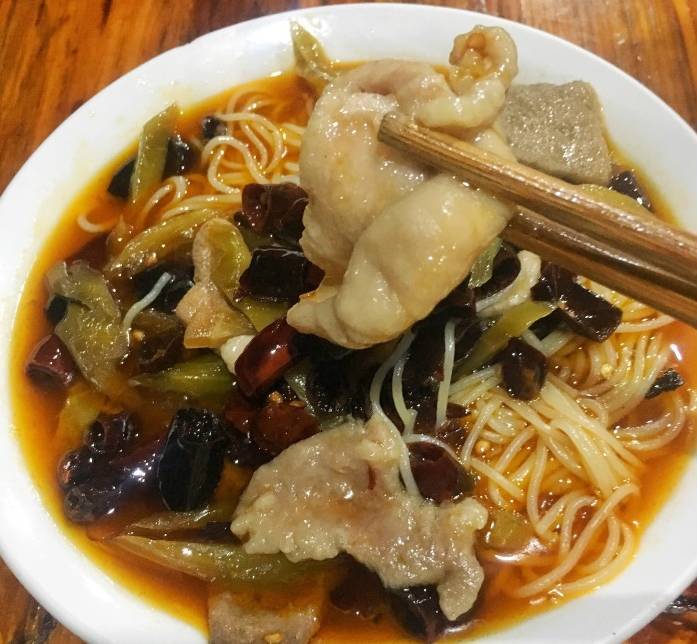 口味主要分為泡椒,番茄,酸菜。可以根據(jù)自己喜好選擇里面的配菜,雖然蹄花軟爛美味,但是泡椒的辣絕對(duì)能讓你懷疑人生!那是非常非常辣,辣得冒汗,辣得嘴掉!