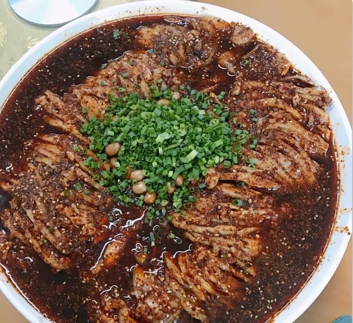 這家的豬耳朵很出名,過來的標(biāo)配一碗耳朵再加碗雜醬。耳片切得極薄,形狀完整,拈起都可以透光,這刀工不擺了。佐料只稍微拌一下,入口連綿帶著膠原的軟糯和脆骨的脆,越吃越香。