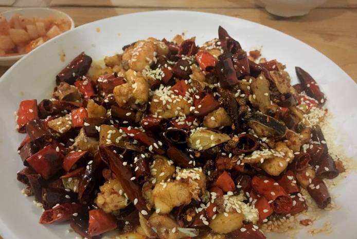 “總有一些味道停留在過去,總有一個(gè)老地方承載著歷史。”社員餐廳就是這樣的存在,歌樂山最出名的也就是辣子雞罷,友人戲稱“紅燈區(qū)找雞”在一堆辣椒堆里尋找那細(xì)微的小雞塊,也是不容易。分量還是很足的。