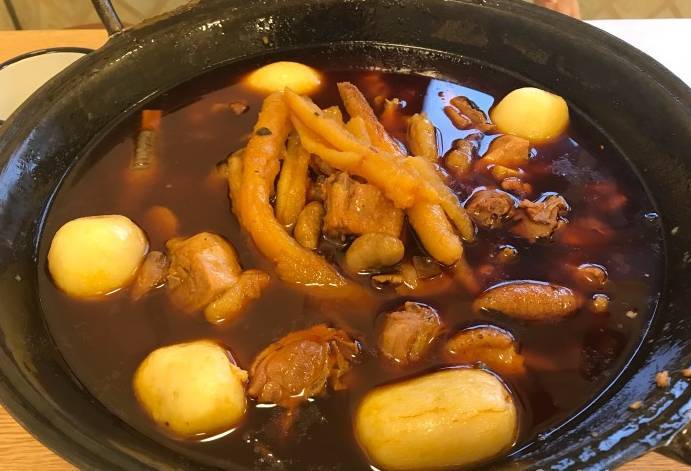 豬腳、燒豬腳湯都可和面食搭配。豬腳單買,小份的有四坨,作逛街小食或餐前打底還好。豬腳湯底色鮮紅亮,燒豬腳的佐料似加有鹵料,味道有點(diǎn)像鹵的,又稍稍帶點(diǎn)辣味討人喜歡。
