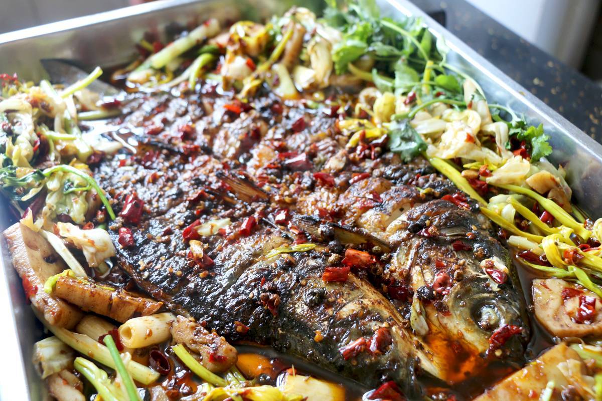 郵亭鯽魚是必點(diǎn)的菜品,濃濃的紅湯上面漂浮著花椒和蔥段,提鮮和提麻的主要作料,搭配的小菜配上魚,真的是絕配。