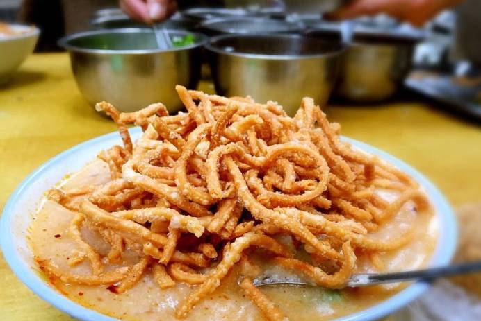 4.5元一碗油茶,3元一個(gè)小糯米團(tuán),4元一個(gè)大糯米團(tuán)。這樣的價(jià)格確實(shí)讓人覺得很實(shí)惠。滿滿實(shí)在的一碗,米糊已經(jīng)拌勻調(diào)料,馓子堆成小山一般。光看賣相,仿佛已經(jīng)嘗到馓子的脆香,米糊的咸辣香。