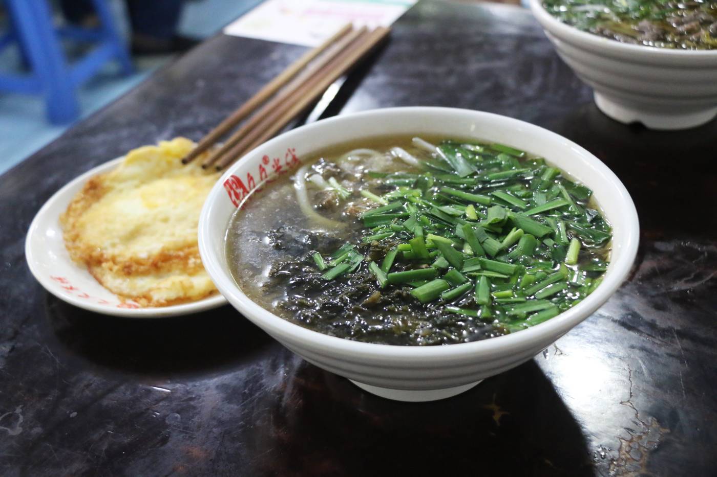 進(jìn)店就能聞到一股濃郁的韭菜味道,酸菜很大一碗飄在碗面上,米粉份量十足。