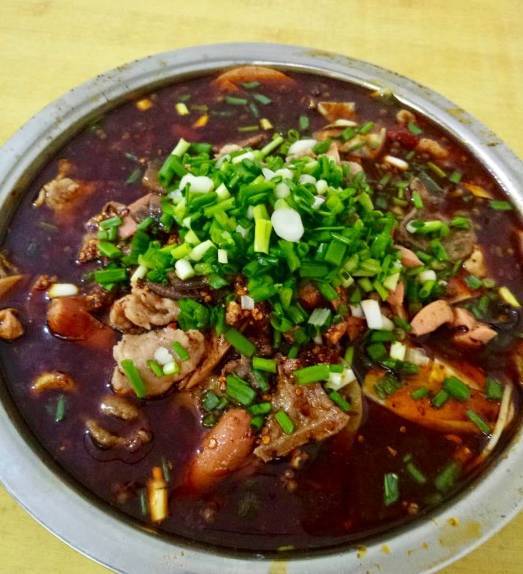 就是一個(gè)破舊居民樓的樓棟,沒有任何門面!沒人帶著真的非常難找。好大的一盆!滿滿的都是肉!血旺,午餐肉,毛肚,五花肉,腰花,肝片,牛舌,下面墊著藕片,苕粉,海帶,豆芽,豆皮,土豆……然后撒上滿滿的香蔥,配合又麻又辣的底料,已經(jīng)不需要再修飾了,這就是完美!
